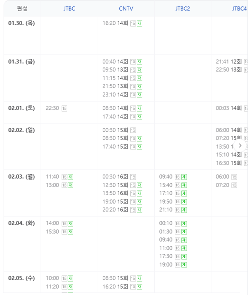 - JTBC: 토요일, 일요일 정규 방송 이후 다양한 시간대 편성.