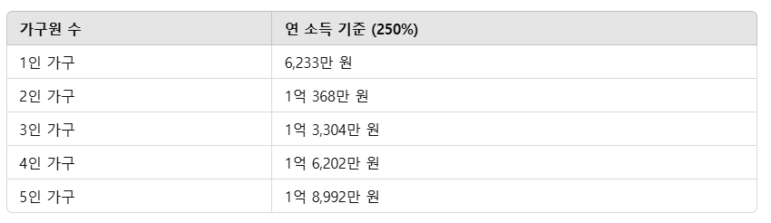 ✔️ 가구소득: 기준 중위소득 250% 이하