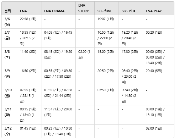 📅 최신 재방송 일정 (2025년 3월 6일 ~ 3월 12일)