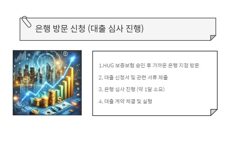 대출 신청은 HUG 보증보험 승인 → 은행 방문 접수 순서로 진행됩니다.