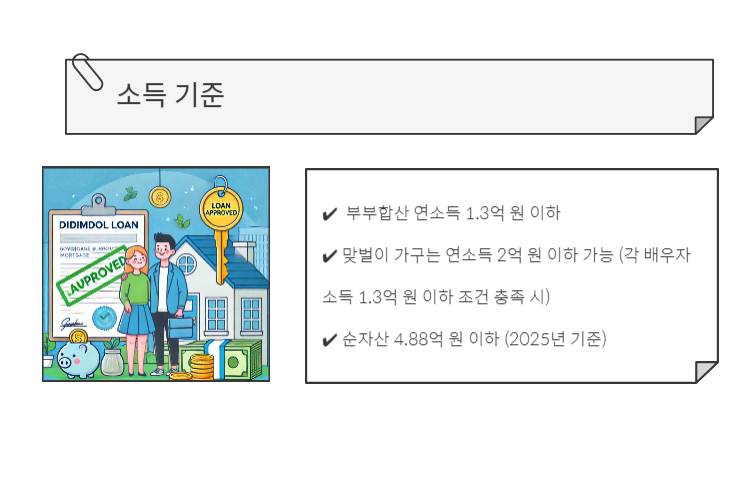 ✔ 맞벌이 가구는 연소득 2억 원 이하 가능 (각 배우자 소득 1.3억 원 이하 조건 충족 시)