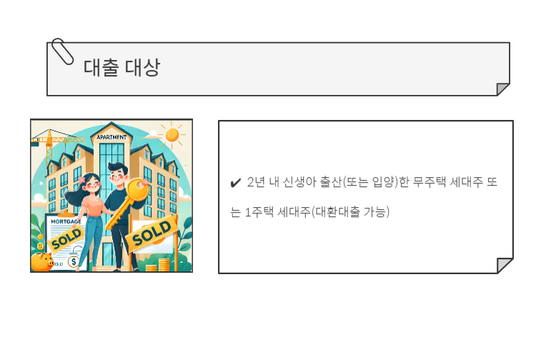✅ 신생아를 출산(또는 입양)한 가구의 주거 안정을 위해 특례로 주택구입자금 대출을 지원하는 정부 정책입니다.