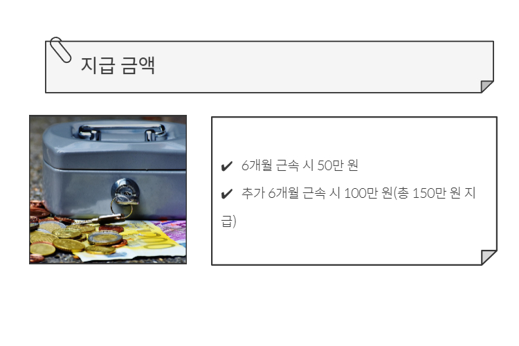 - 추가 6개월 근속 시 100만 원(총 150만 원 지급)