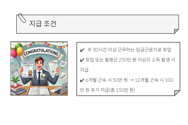 ✔️ 6개월 근속 시 50만 원 → 12개월 근속 시 100만 원 추가 지급(총 150만 원)